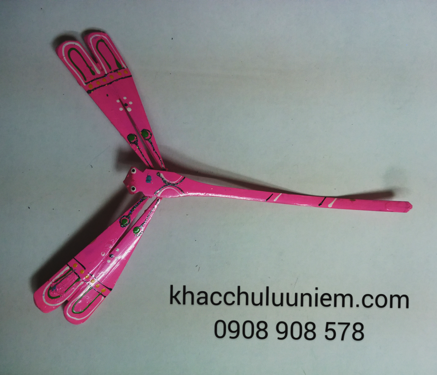 Con chuồn chuồn ớt nho nhỏ, bằng tre được sơn các màu xanh, đỏ, tím, vàng, hồng, phủ nhũ lấp lánh và vẽ họa tiết cầu kỳ.