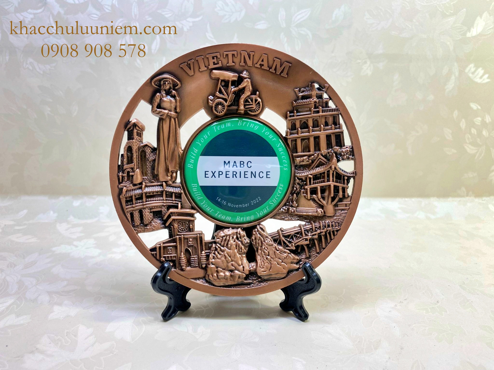 Đĩa làm bằng chất liệu hợp kim đúc nổi mô phỏng các địa danh, phong cảnh nổi tiếng của Việt Nam.