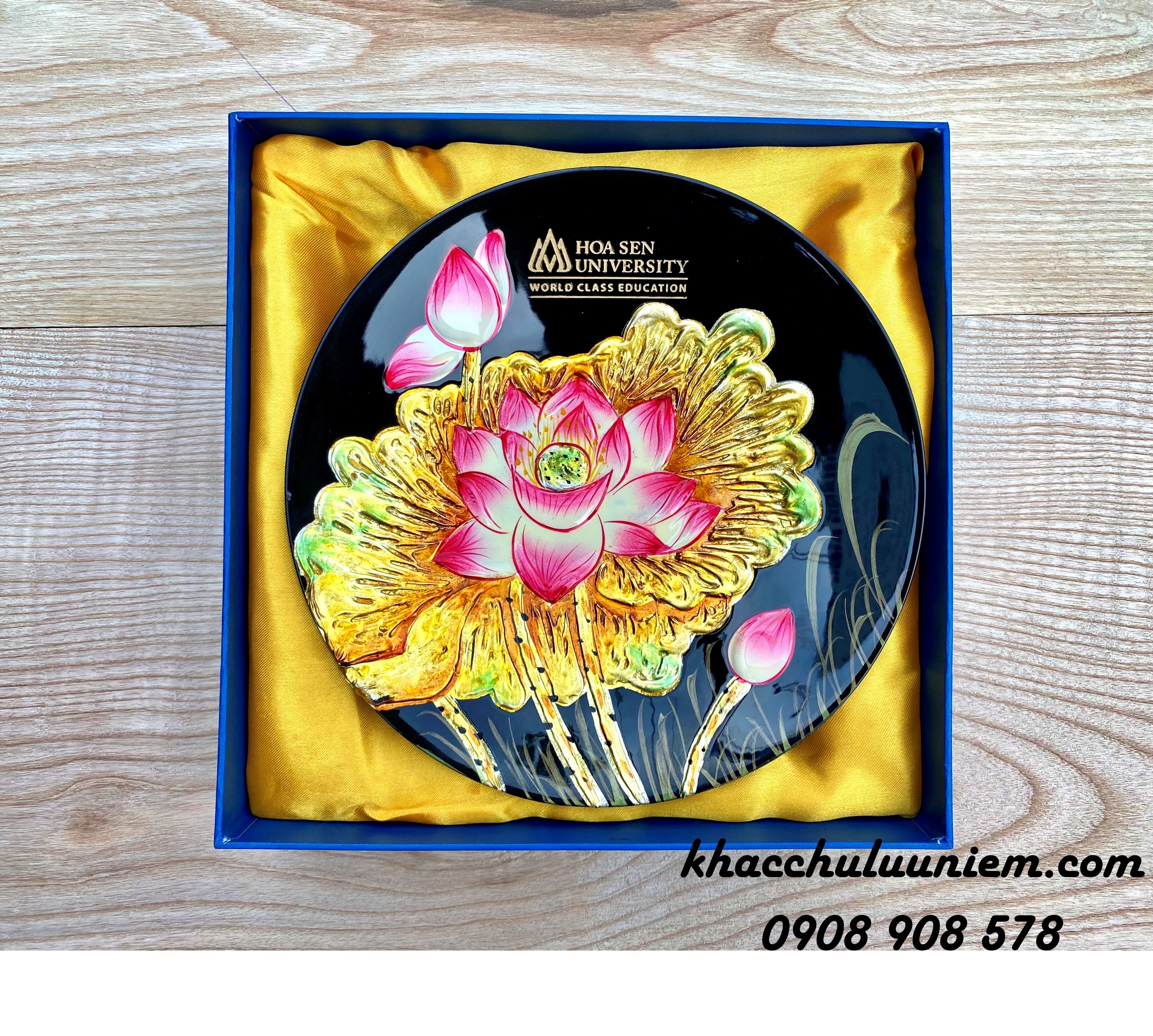 Đĩa sơn mài vẽ thủ công bằng tay , có khắc logo trường đại học hoa sen.