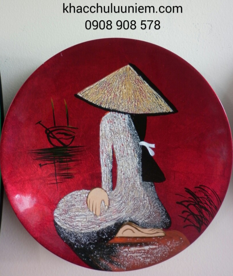 Tranh sơn mài cô gái việt nam đội nón lá ngồi được trưng bày tuyệt đẹp và ý nghĩa với treo tường hoặc kệ trưng bày nhé.