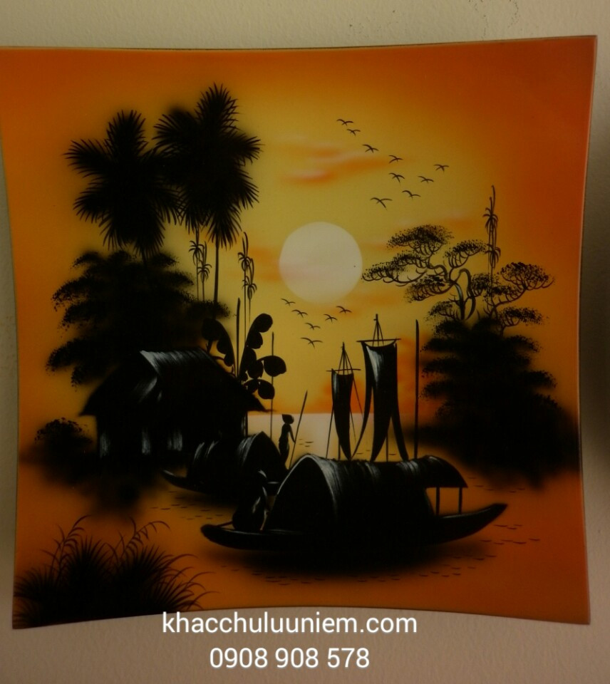 Tranh đĩa Vuông sơn mài phong cảnh làng quê Việt Nam.